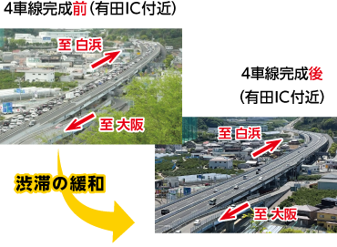 また、南紀田辺ICまでの4車線化にも取り組んでおり、令和3年12月には有田IC〜印南IC間が完成し、渋滞はほぼ解消しました。残る印南IC〜南紀田辺ICについても、早期完成をめざしています。