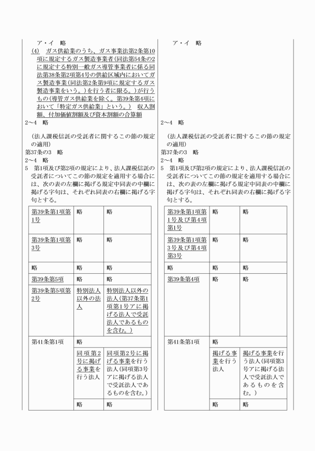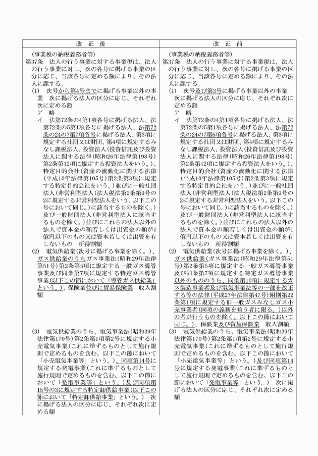3 施行日以後最初に開始する事業年度(以下この項及び附則第6項において「最初事業年度」という。)開始の日の前日を含む事業年度において、ガス供給業のうち新条例第37条第1項第2号に規定する導管ガス供給業及び同項第4号に規定する特定ガス供給業以外のもの(以下この項において「対象ガス供給業」という。)を行っていた法人(ガス事業法(昭和29年法律第51号)第2条第10項に規定するガス製造事業者又は電気事業法等の一部を改正する等の法律(平成27年法律第47号)附則第22条第1項に規定する旧一般ガスみなしガス小売事業者(同項の義務を負う者に限る。)(附則第6項において「ガス製造事業者等」という。)に限る。)の対象ガス供給業に係る事業税の課税標準である各事業年度の所得を地方税法等の一部を改正する法律(令和4年法律第1号。以下この項及び附則第6項において「令和4年地方税法等改正法」という。)第1条の規定による改正後の地方税法(昭和25年法律第226号)第72条の23第1項の規定により当該法人の当該各事業年度の法人税の課税標準である所得の計算の例により算定する場合には、当該法人が、当該法人の最初事業年度開始の日前10年以内に開始した各事業年度において、対象ガス供給業に係る事業税の課税標準である当該各事業年度の所得を令和4年地方税法等改正法第1条の規定による改正前の地方税法第72条の23第1項の規定により当該法人の当該各事業年度の法人税の課税標準である所得又は当該各事業年度終了の日の属する各連結事業年度(所得税法等の一部を改正する法律(令和2年法律第8号)第3条の規定(同法附則第1条第5号ロに掲げる改正規定に限る。)による改正前の法人税法(昭和40年法律第34号。以下この項において「令和2年改正前法人税法」という。)第15条の2第1項に規定する連結事業年度をいう。附則第6項において同じ。)の法人税の課税標準である連結所得(令和2年改正前法人税法第2条第18号の4に規定する連結所得をいう。附則第6項において同じ。)に係る当該法人の個別所得金額(令和2年改正前法人税法第81条の18第1項に規定する個別所得金額をいう。附則第6項において同じ。)の計算の例により算定していたものとみなす。