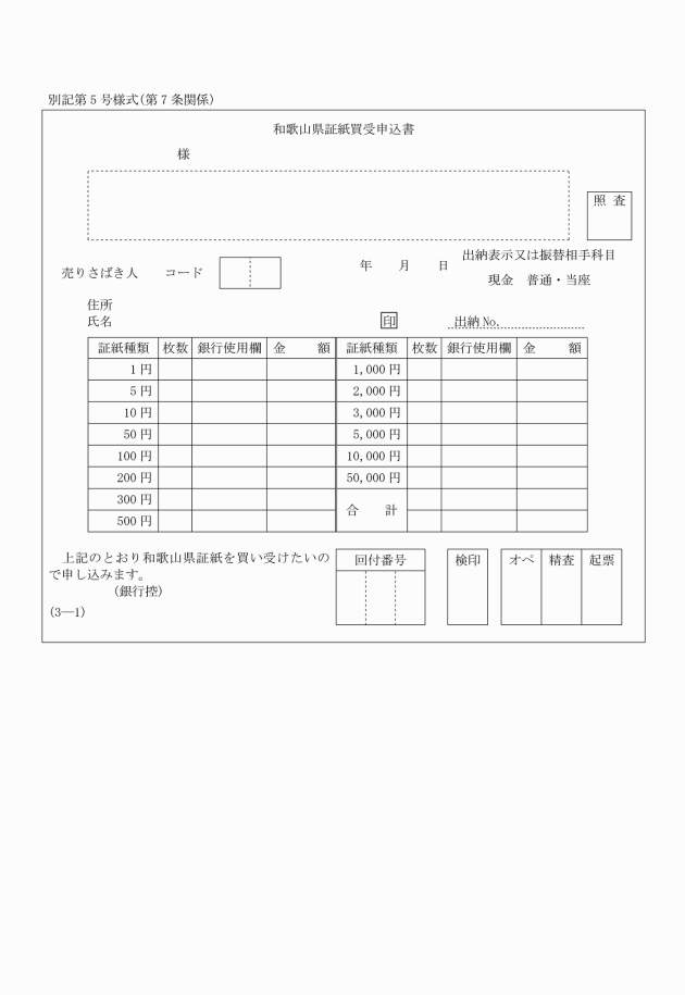 2 指定金融機関の総括店(和歌山県指定金融機関等事務取扱規則(平成7年和歌山県規則第87号)第2条第2項に規定する総括店をいう。以下同じ。)は、証紙交付申請書により会計課から証紙の交付を受け、これをその本店営業部若しくは支店又はその他の営業所に交付しなければならない。