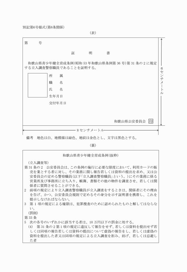 第6条 条例第31条の2第2項の公安委員会規則で定めるその身分を示す証明書の様式は、別記第6号様式のとおりとする。