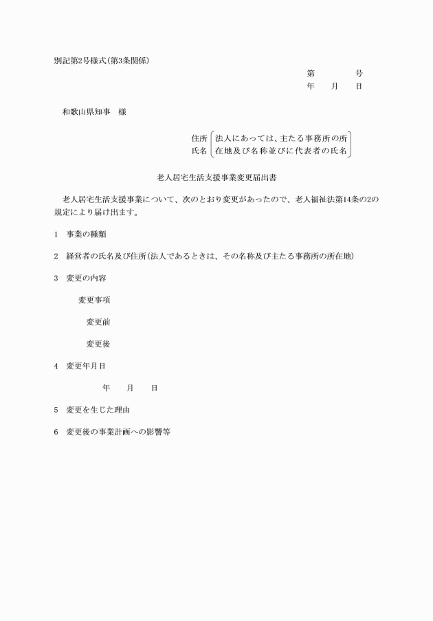 第3条 法第14条の2の規定による届出は、老人居宅生活支援事業変更届出書(別記第2号様式)によらなければならない。