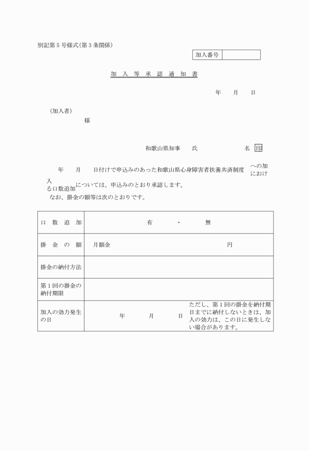 2 改正前の和歌山県心身障害者扶養共済制度条例施行規則別記第1号様式に基づき作成されている用紙は、当分の間、使用することができる。