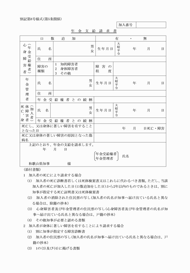 第8条の2 条例第13条の2第1項に規定する脱退一時金の支給の請求は、脱退一時金支給請求書(別記第19号様式の2)に次に掲げる書類を添えてこれを知事に提出して行わなければならない。ただし、知事が和歌山県本人確認情報等の利用及び提供に関する条例別表第1第2項の規定により加入者及びその扶養する心身障害者に係る本人確認情報を利用できるときは、次に掲げる書類を添付することを要しない。