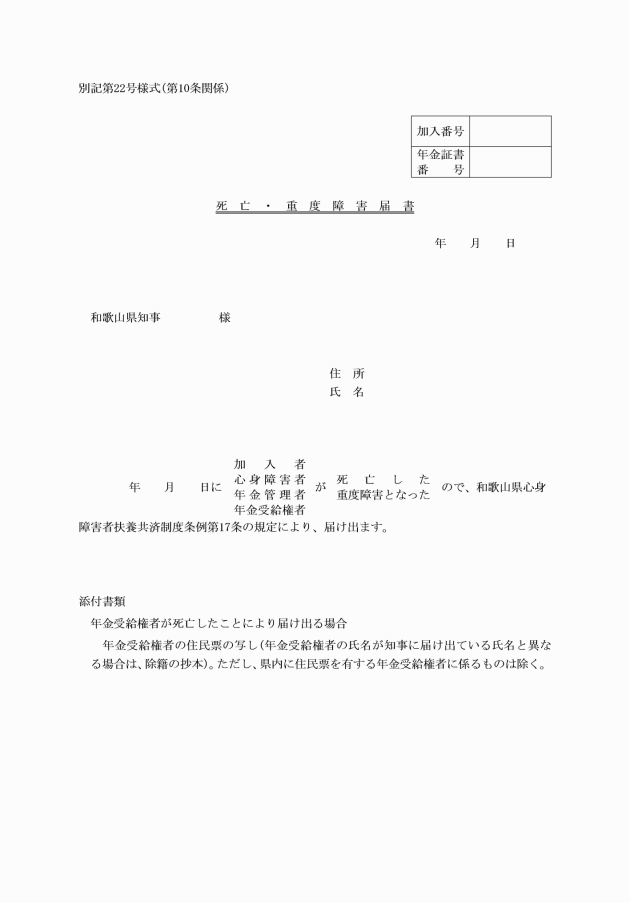 (2) 条例第17条第1項第2号、同条第2項第1号及び同条第3項第2号の届出をする場合 死亡・重度障害届書(別記第22号様式)