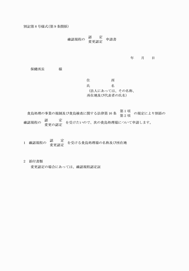 2 法第16条第2項の規定による確認規程の変更の認定を受けようとする者は、別記第8号様式による申請書を保健所長に提出しなければならない。