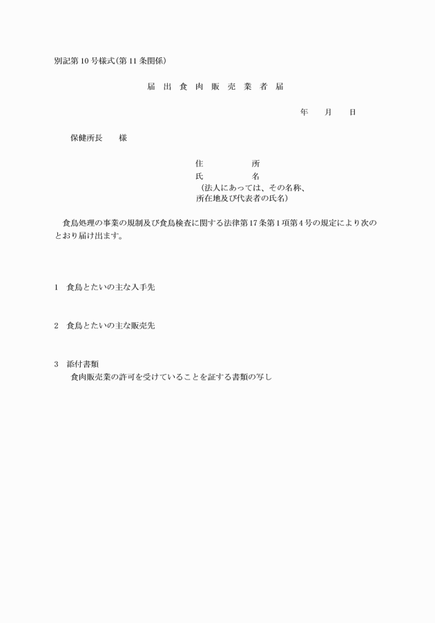 第11条 法第17条第1項第4号の規定による届出を行う者は、別記第10号様式による届出書を保健所長に提出しなければならない。