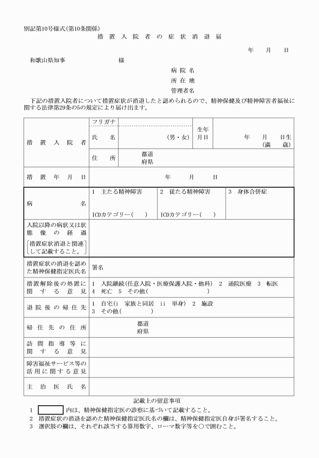 第10条 法第29条の5の規定による届出は、措置入院者の症状消退届(別記第10号様式)により行うものとする。