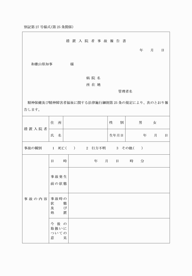 第24条 精神科病院の管理者は、法第40条の規定による許可を受けようとするときは、措置入院者仮退院許可申請書(別記第25号様式)を最寄りの保健所長(和歌山市保健所長を除く。以下同じ。)を経て知事に提出するものとする。