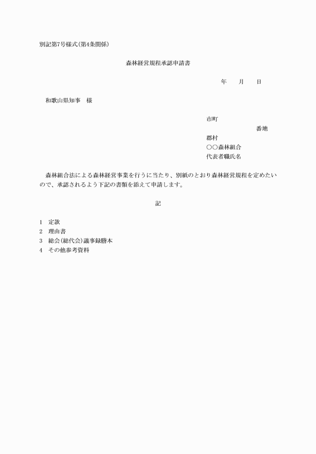 第4条 法第26条の3第1項の規定により森林経営規程の承認を受けようとする者は、森林経営規程承認申請書(別記第7号様式)を知事に提出しなければならない。