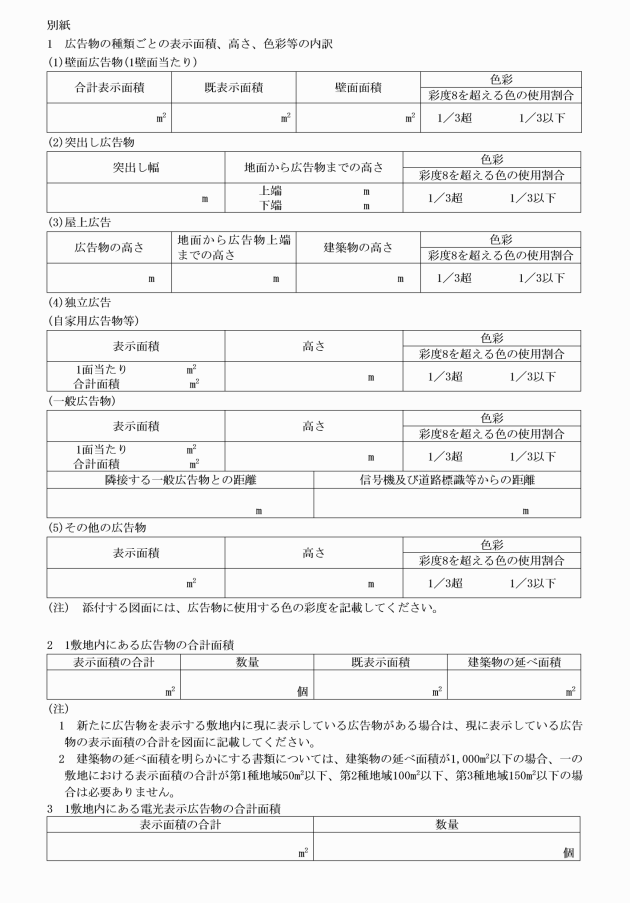 1 「表示面積の合計」とは、表示しようとする広告物の面積と既に表示されている広告物の面積を合算したものをいう。