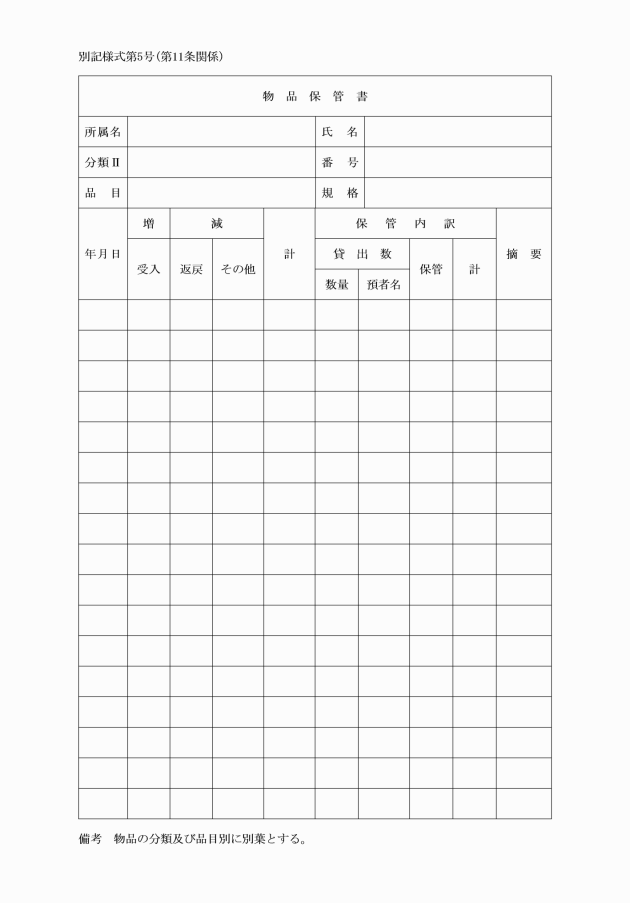 第11条 物品供用員は、供用のため物品の払出しを必要とするときは、物品供用書(別記様式第4号)により本部長に払出しを請求するものとする。