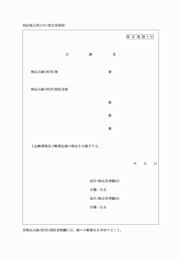 第22条 物品管理職員の交替があった場合においては、前任の物品管理職員は、引継書(別記様式第13号)を交替の日の前日をもって作成し、これに後任の物品管理職員とともに記名したものを引き継ぐべき物品出納簿又は物品供用簿に添付して、これらを当該後任の物品管理職員に引き継ぐものとする。ただし、前任の物品管理職員が引継ぎの手続をすることができない事由があるときは、後任の物品管理職員が引継書を作成し、これに記名するものとする。