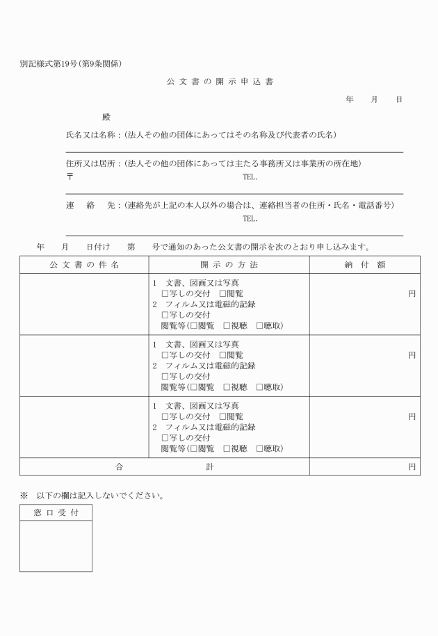 第9条 公文書の開示を受ける者は、公文書の開示申込書(別記様式第19号)を提出しなければならない。