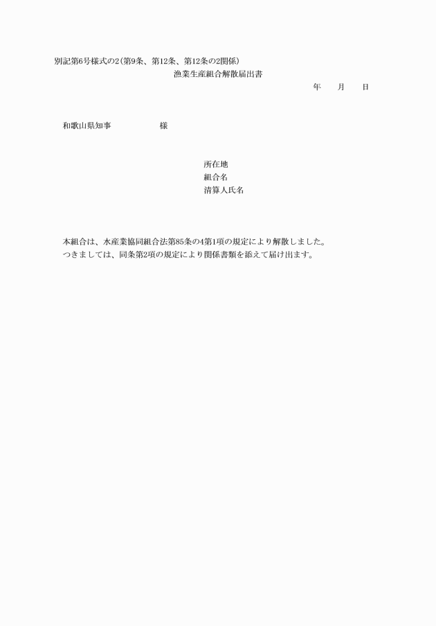 2 漁業生産組合は、法第85条の4第2項の規定により解散の届出(同条第1項の規定により解散した場合に限る。)をしようとするときは、解散の日から2週間以内に、漁業生産組合解散届出書(別記第6号様式の2)に解散理由書及び解散の登記に係る登記事項証明書を添えて、知事に提出しなければならない。
