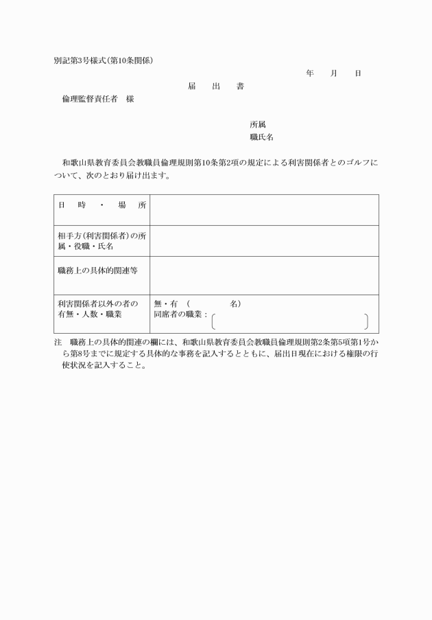 2 教育長及び教職員は、自己のゴルフに要する費用を負担し、利害関係者と共にゴルフをする場合において、次に掲げる場合を除き、あらかじめ、届出書(別記第3号様式)により、倫理監督責任者に届け出なければならない。ただし、やむを得ない事情によりあらかじめ届け出ることができなかったときは、事後において速やかに届け出なければならない。