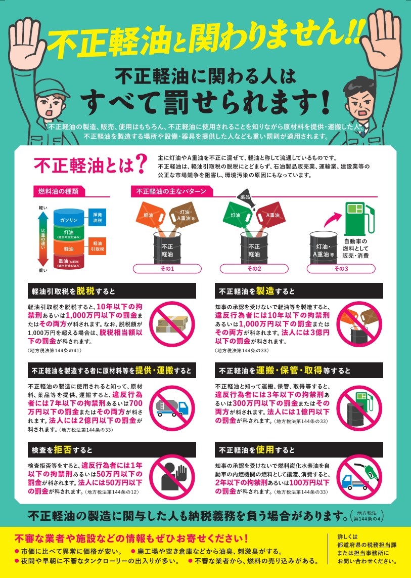 - 不正軽油を製造・販売・消費することは、脱税行為です。