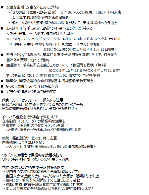 ・各県が、まん延防止等重点措置を実施している期間中は、当該区域への不要不急の外出を控えてください。やむを得ず外出が必要な場合は、基本的な感染症対策を徹底してください。