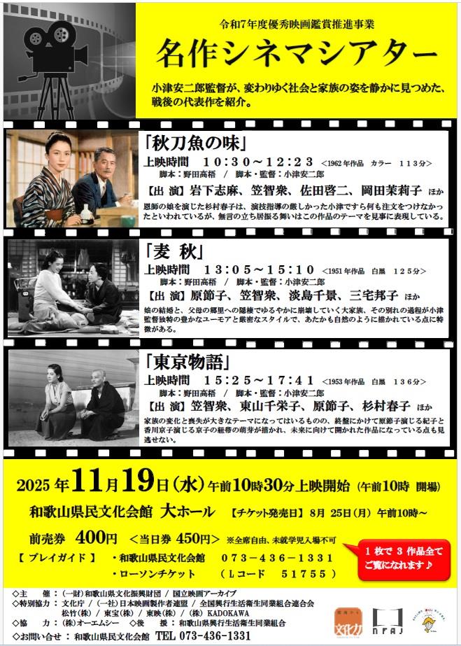 本県は、県民の皆様と共に「文化で元気な地域づくり」を目指し、様々な文化振興事業に取り組んでいる。その1つとして、日本の映像技術を支えてきた優れた日本映画を鑑賞して頂く機会として、昭和の優秀映画鑑賞推進事業を開催する。 ○上映作品(3作品) ・1962年上映作品「秋刀魚の味」 ・1951年上映作品「麦秋」 ・1953年上映作品「東京物語」 ○実施場所:和歌山県民文化会館大ホール ○実施主体:一般財団法人和歌山県文化振興財団(県指定管理者)、国立映画アーカイブ共催![]() |