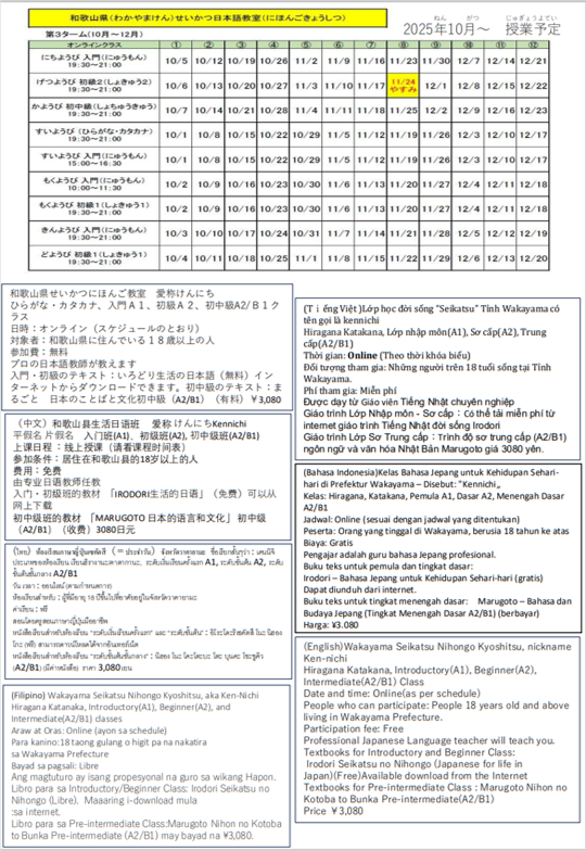 • 授業料 無料。ただし、初中級 (A2/B1) クラスは指定のテキスト(まるごと 日本のことばと文化 初中級 A2/B1) をご用意ください。