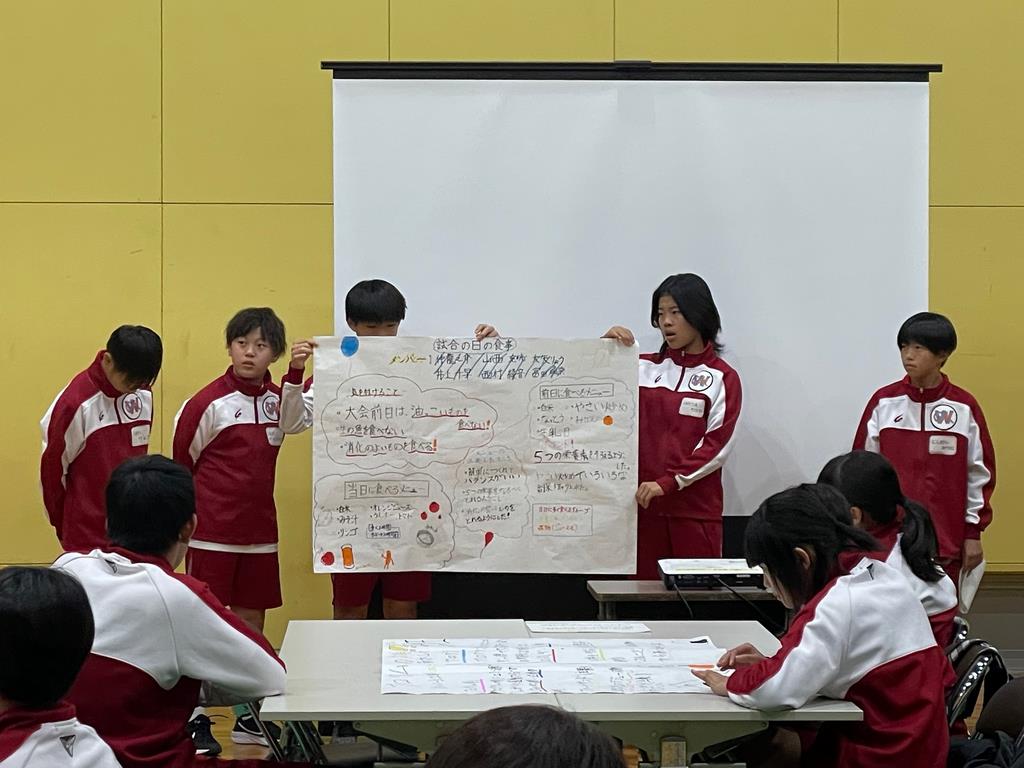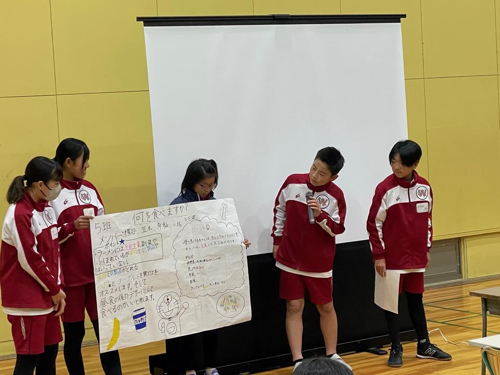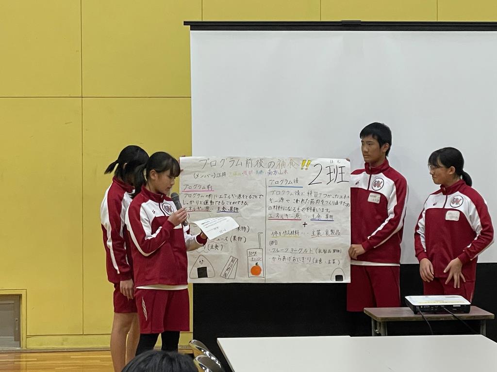 前回まとめたケーススタディの発表をしました。グループごとに与えられた課題に対する食事内容について自分たちはなぜこの食事を選んだのか、今まで学習してきたことをもとに自分たちなりに考えました。