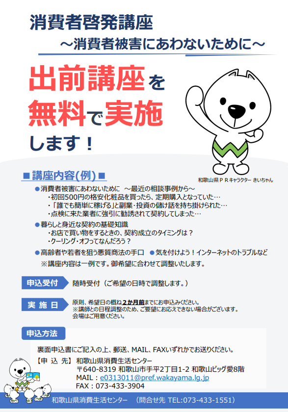 和歌山県消費生活センターと連携して、県内の学校や団体に対して専門の講師を派遣しています。