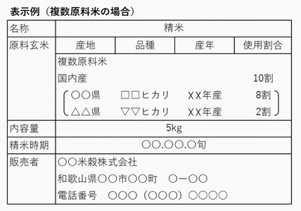 - 単一原料米以外の原料玄米を用いる場合は、「複数原料米」等と記載し、国産品は「国内産 △割」と、輸入品は原産国ごとに「○○産 △割」と使用割合の多い順に記載します。