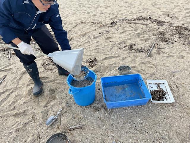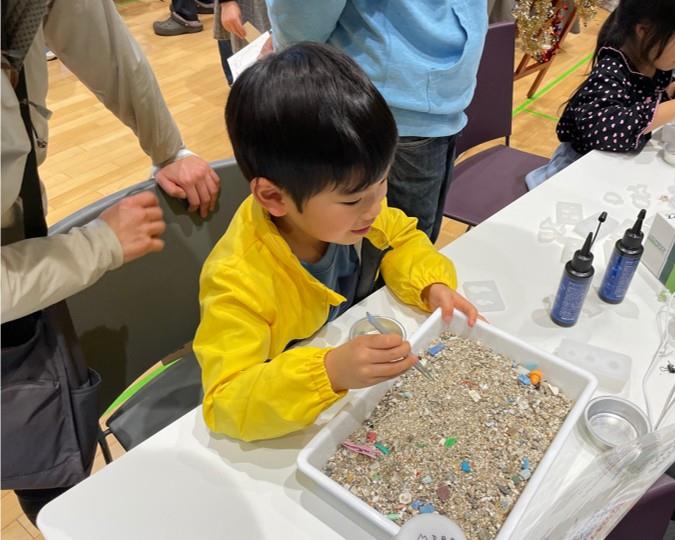 - 海岸の砂の中からマイクロプラスチックを探して、レジンアートでキーボルダーやマグネットを作る体験をしてもらいました。