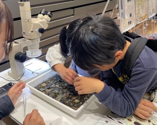 - 本物の水生生物の標本を用いて川のミニチュアを再現し、その中に隠れている生物を探し、何という生物なのかを判定してもらいました。今回は顕微鏡を使って見つけた生物の観察してもらい、水生生物がどのような体のつくりをしているのか、またその見分け方などを学んでもらいました。