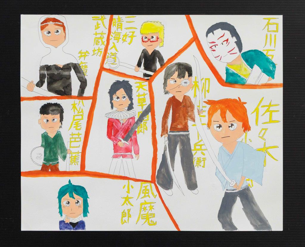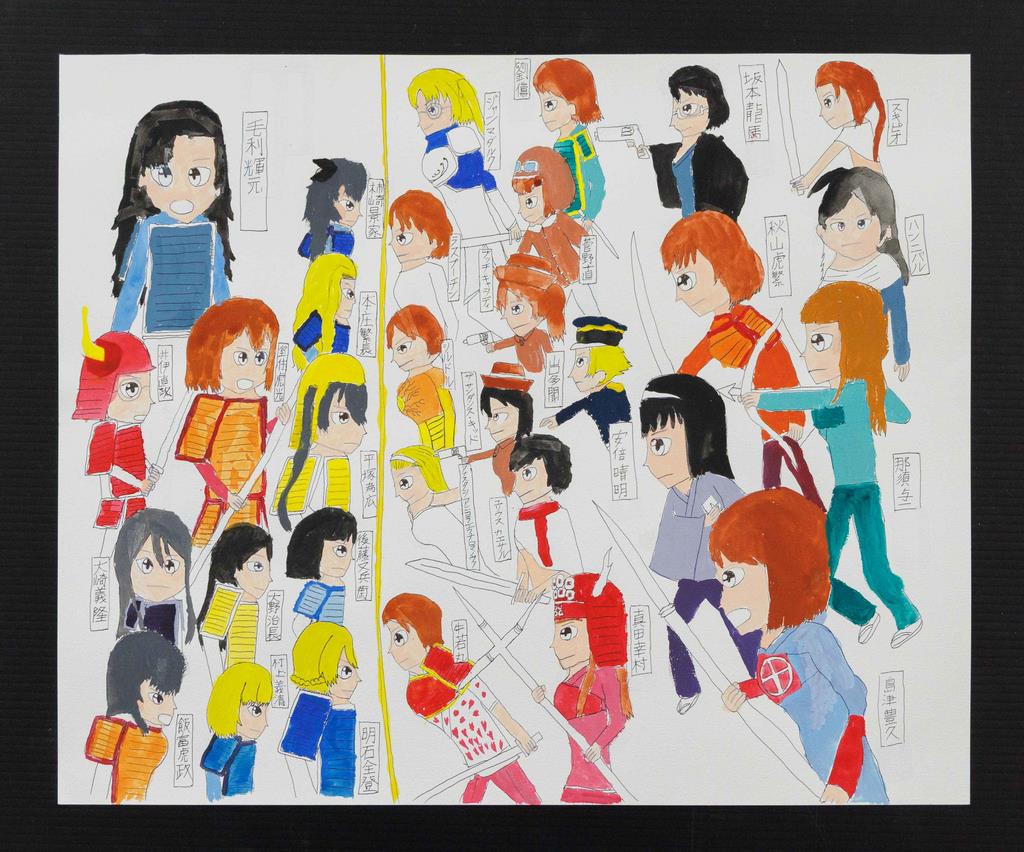 もう一枚は過去のアイドル「ドリフターズ」に登場する世界の人物と好きな武将を描いてみました。 |
