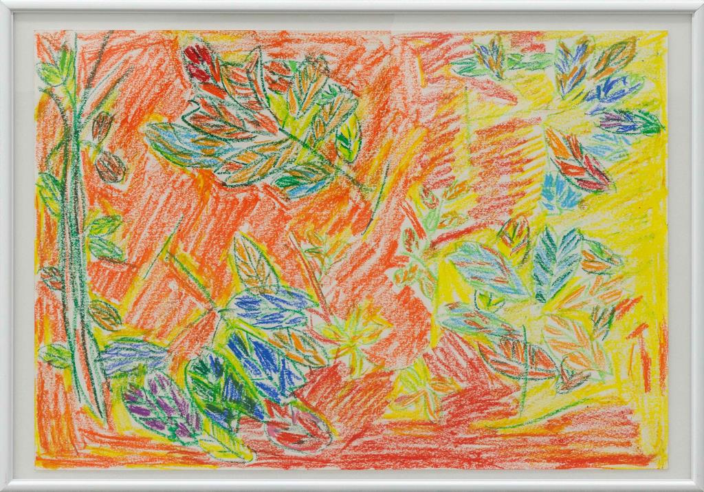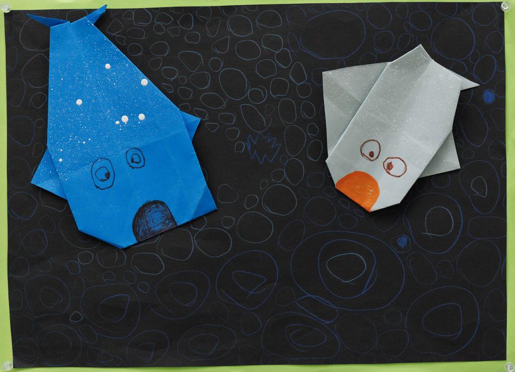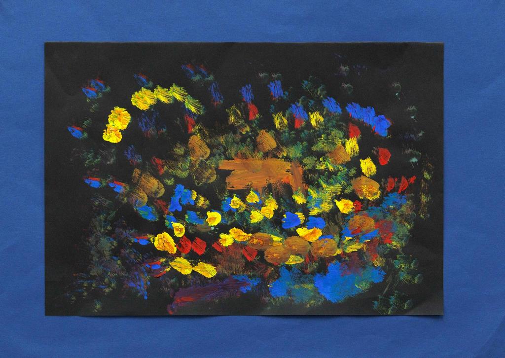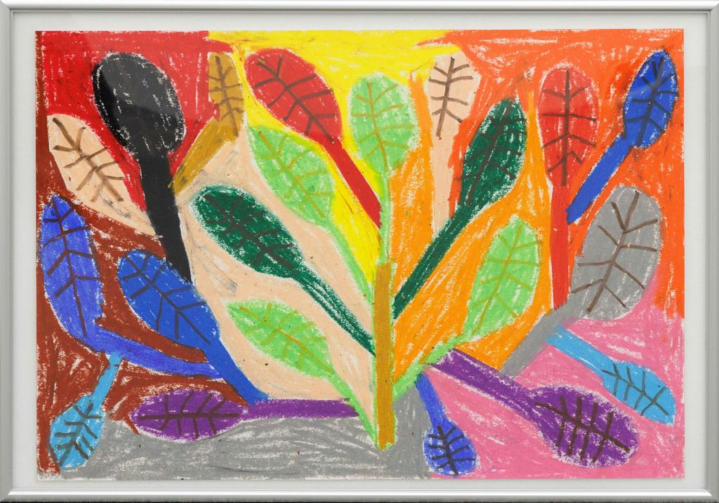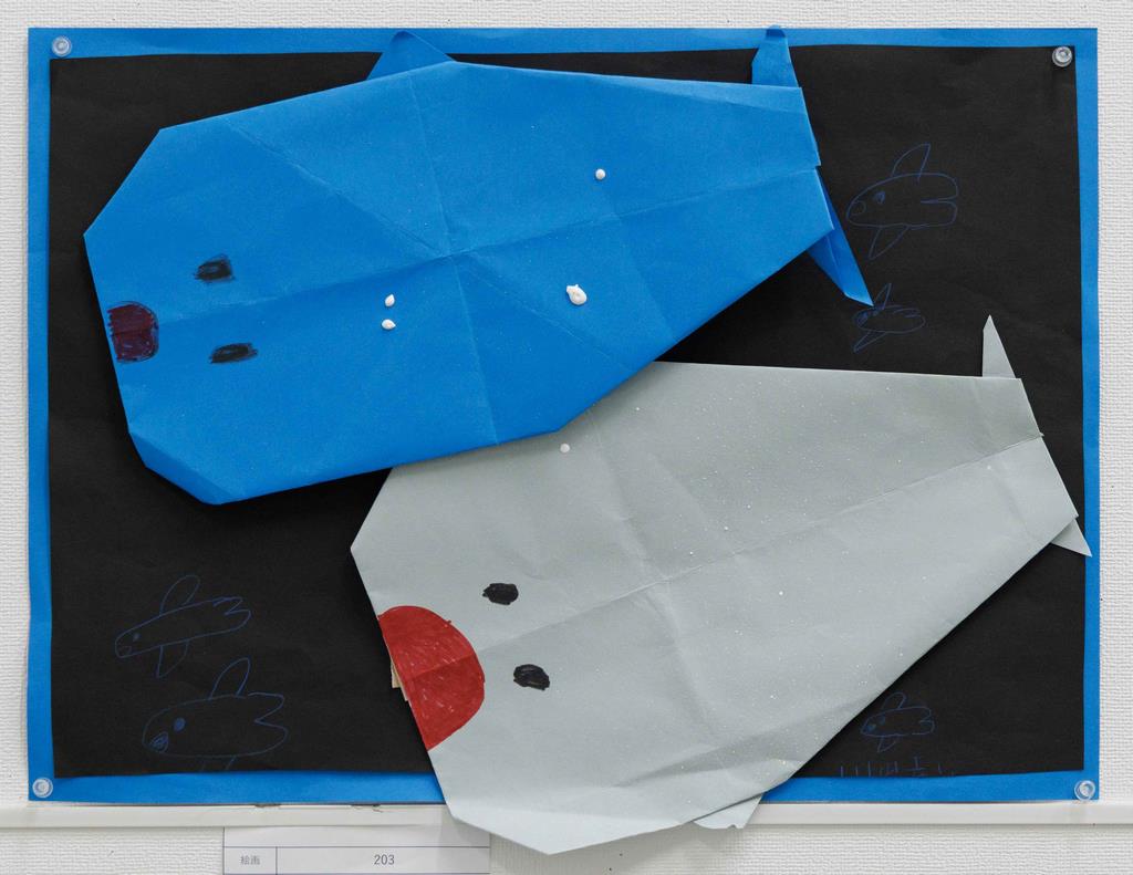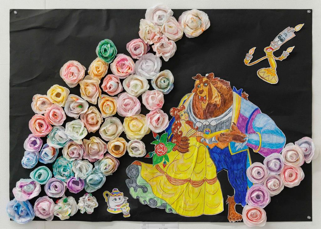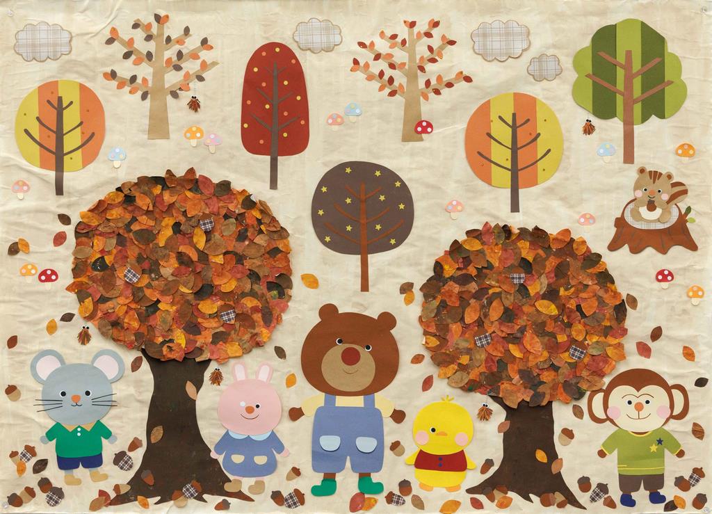 この作品は秋っぽさを表現する色合いにこだわりました。特に葉っぱは半紙をたくさんの色で染めて1枚ずつ切りました。動物たちの表情にも工夫したので温かみのある楽しい作品になったかなと思います。 |