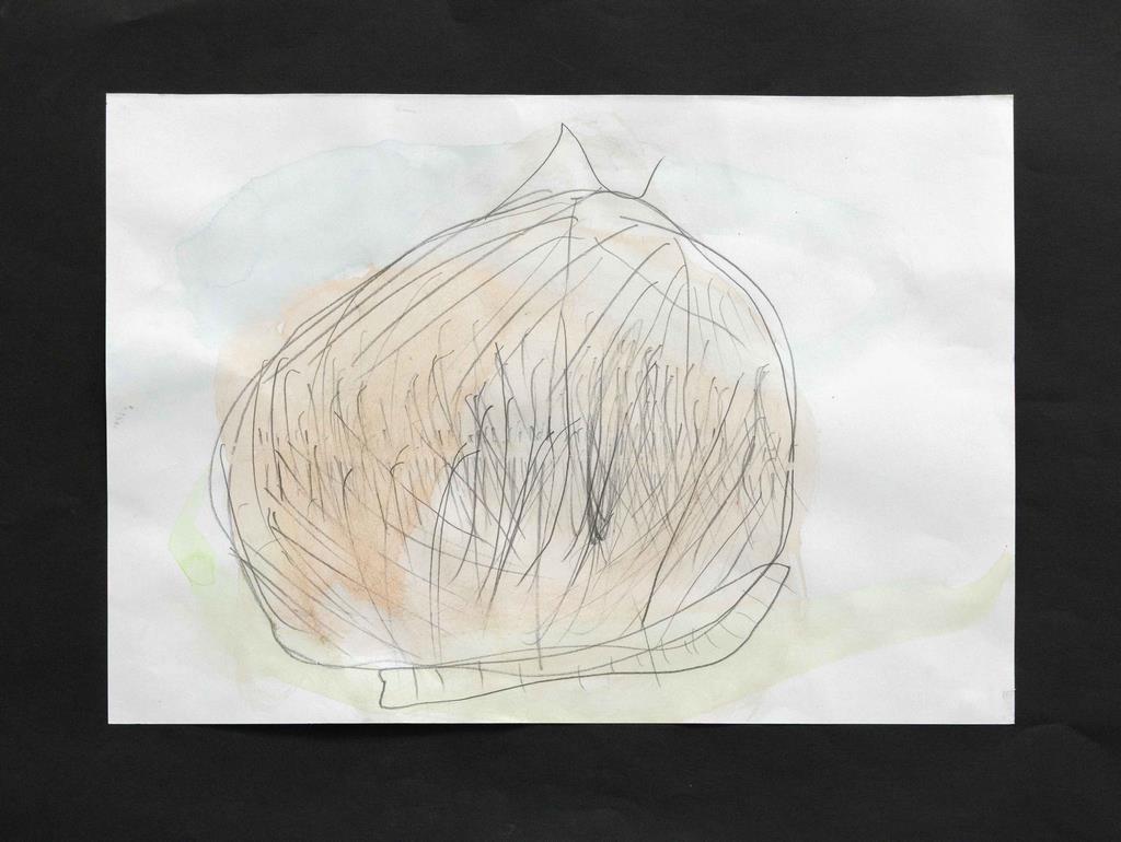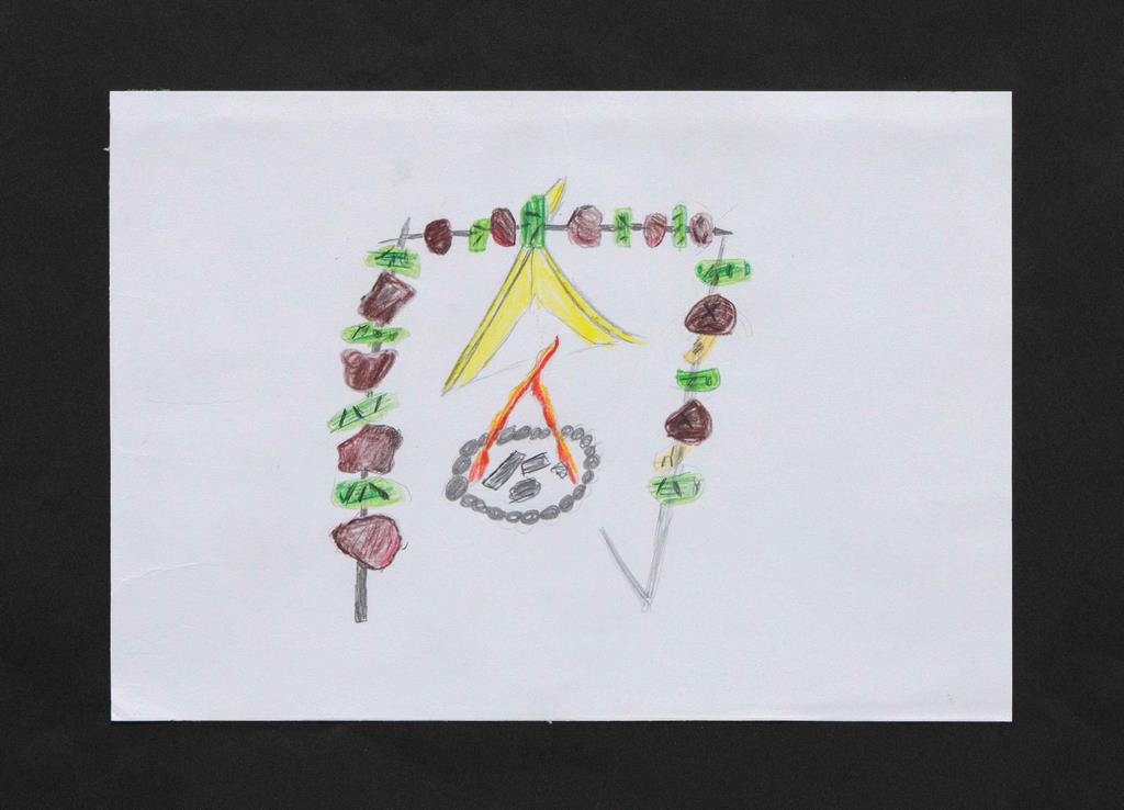 バーベキューをした話を聞いて、キャンプや『肉』をイメージしました。文字の形からテントやキャンプファイヤー等をちょい足ししました。 |