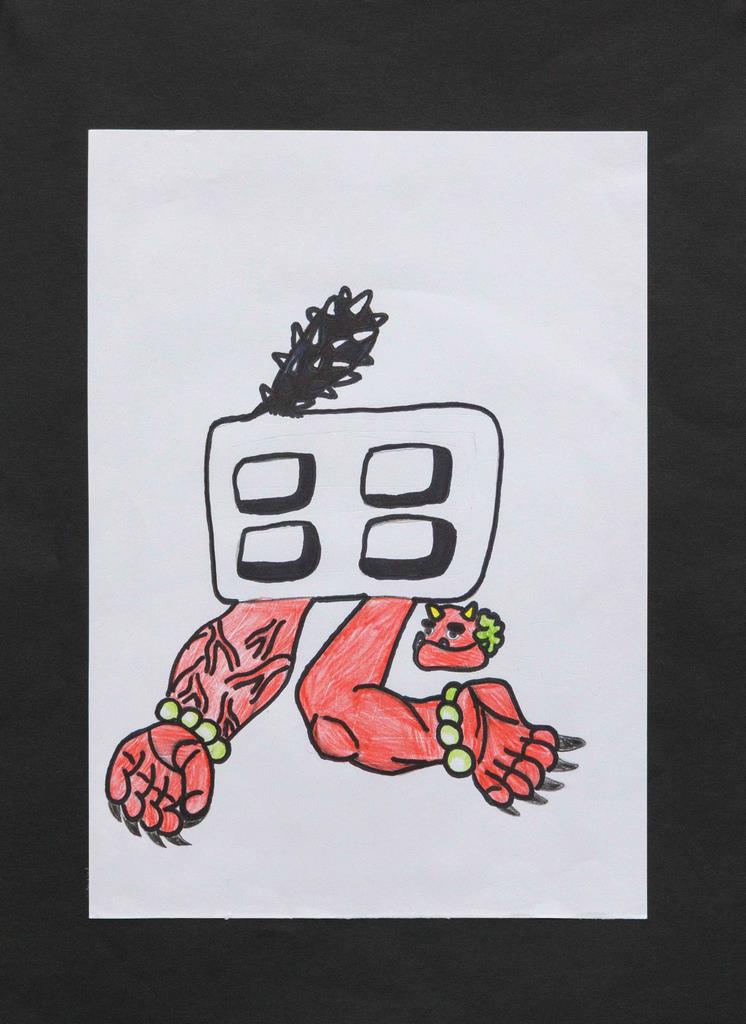 映画を観に行った話を聞いて、『鬼』をイメージしました。文字の形から鬼の力強さをちょい足ししたいと考え、金棒やたくましい腕を表しました。 |