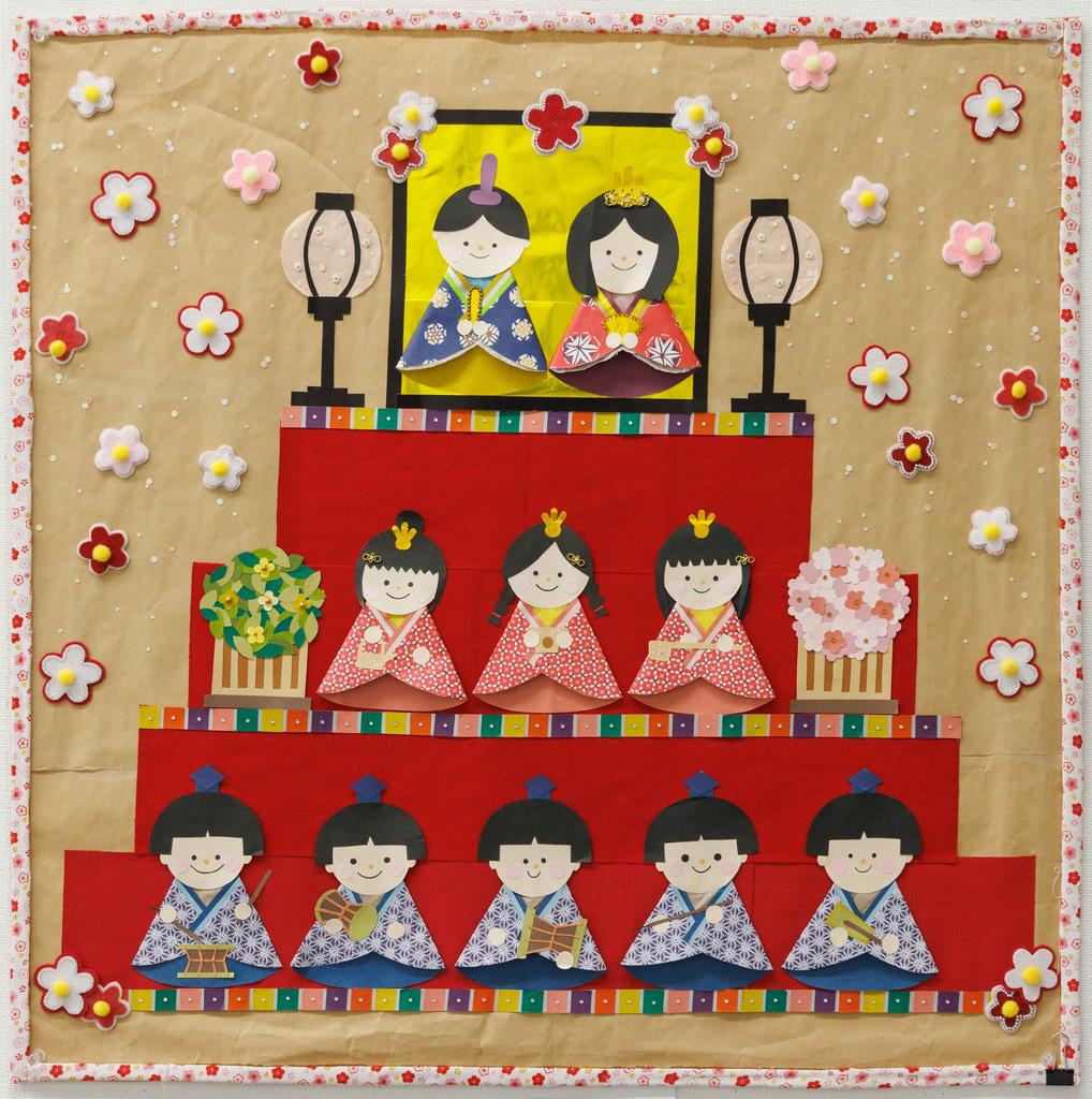 おりがみやフェルト、ちりめん布などの色々な素材を使って作りました。1人1人の顔のパーツや着物の襟の重ね方にこだわって完成させました。春らしい華やかな作品に仕上がりました。 |