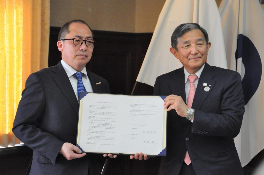 協定書に署名【奥:木越学長 手前:仁坂知事】