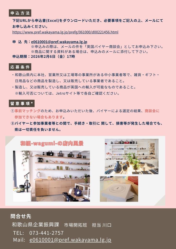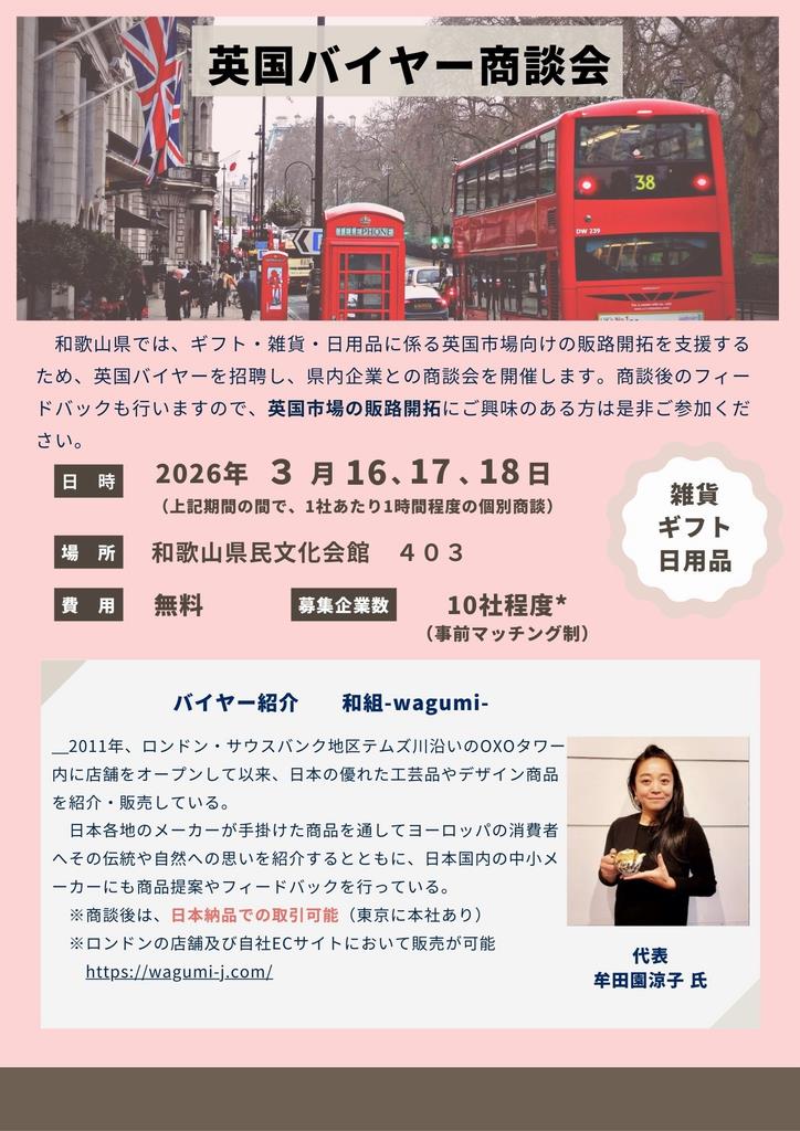 和歌山県では、ギフト・雑貨・日用品に係る英国市場向けの販路開拓を支援するため、英国バイヤーを招聘し、県内企業との商談会を開催します。商談後のフィードバックも行いますので、英国市場の販路開拓にご興味のある方は是非ご参加ください。