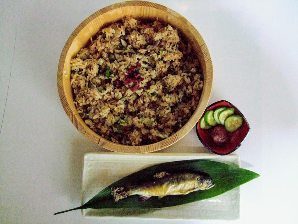 - 炊きあがったら鮎の身をほぐして1cmずつに切ってまぜる。(キッチンバサミを使うと切りやすい)