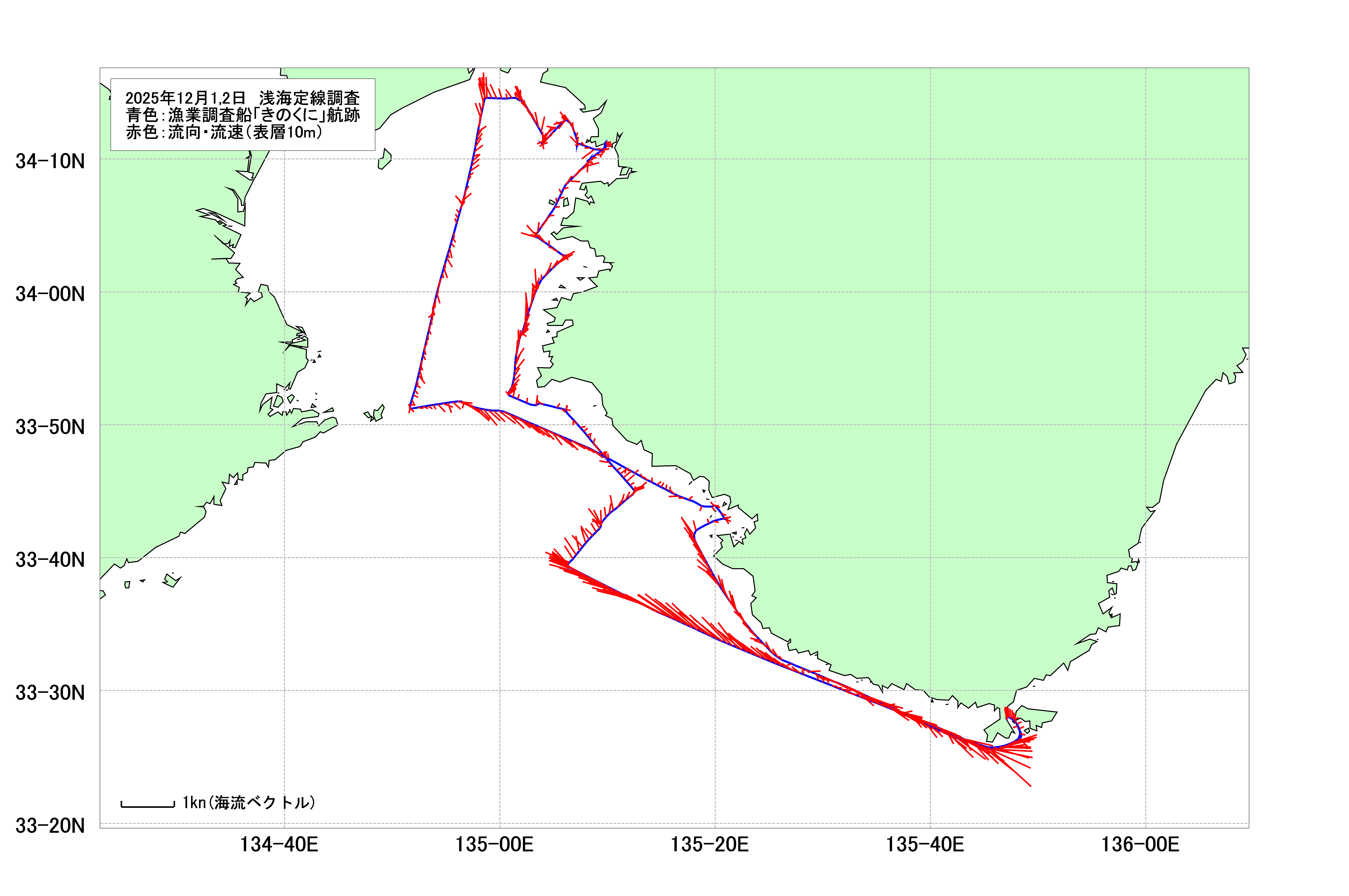 - 浅海定線調査(田倉埼沖~田辺湾)(2025年12月1日,2日) 海洋観測速報1 海洋観測速報2 海表面水温等温線図 調査船航跡・潮流図