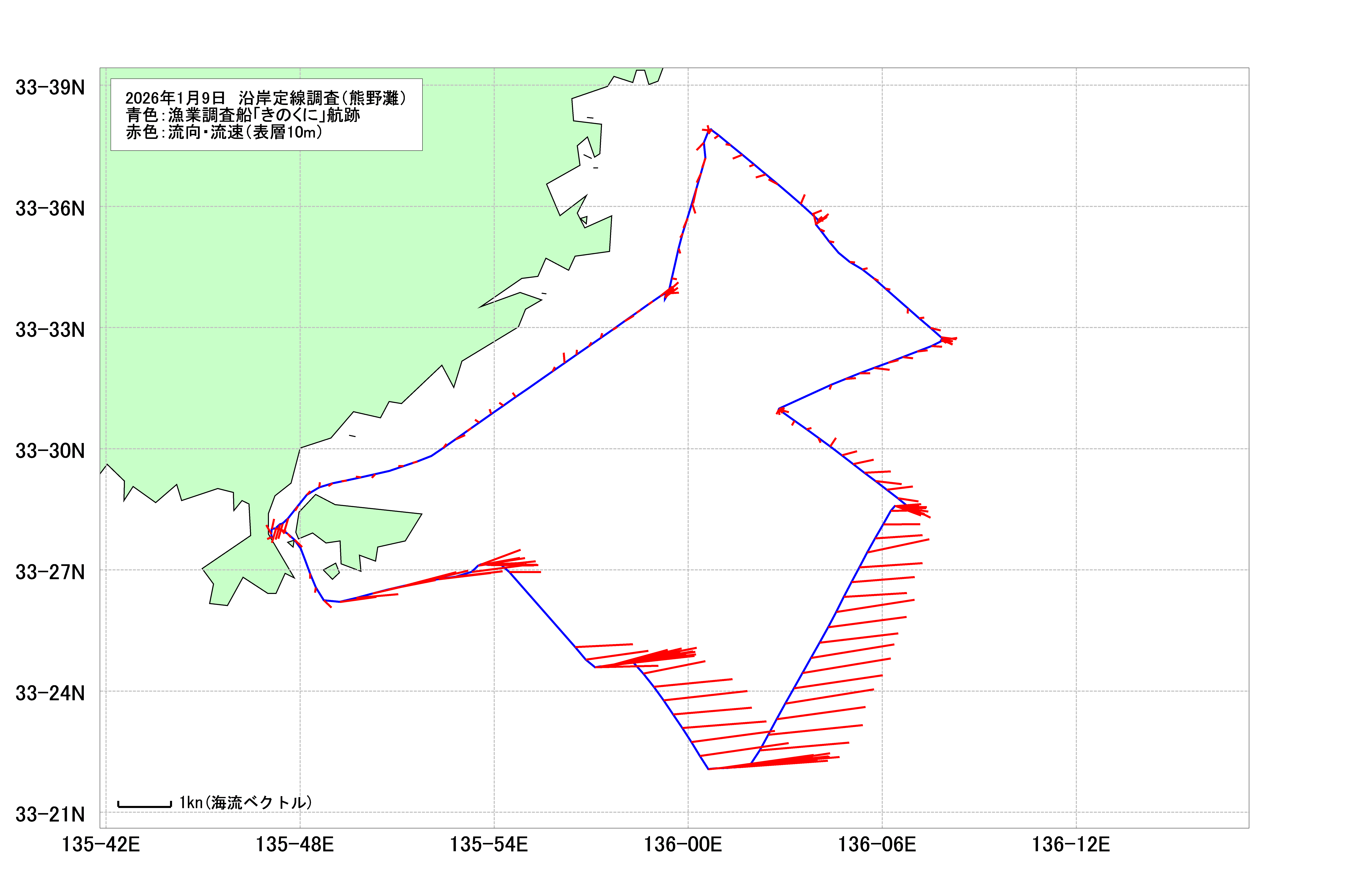 - 沿岸定線調査(樫野埼沖~駒埼沖)(2026年1月9日) 海洋観測速報 海表面水温等温線図 調査船航跡・潮流図