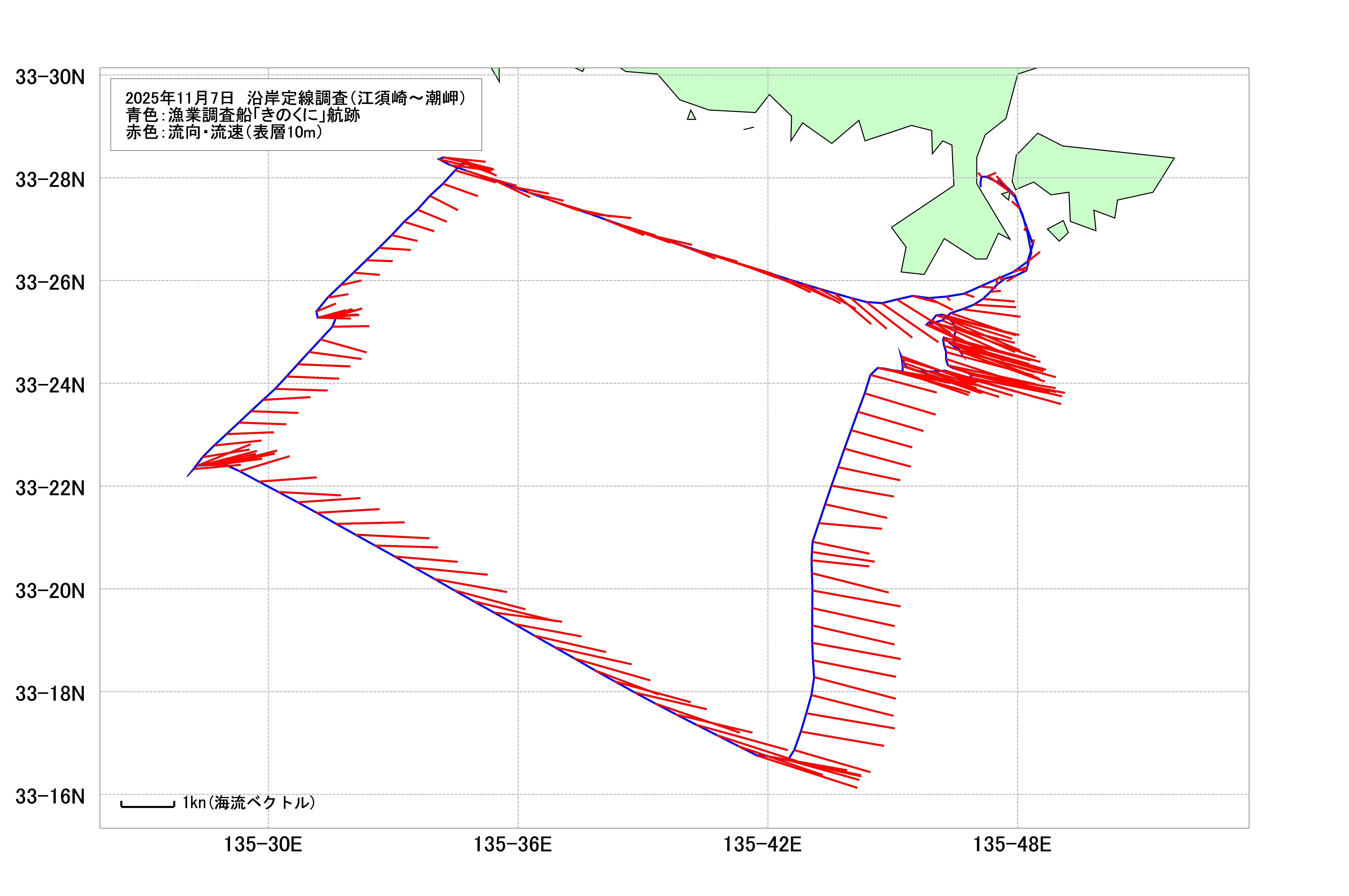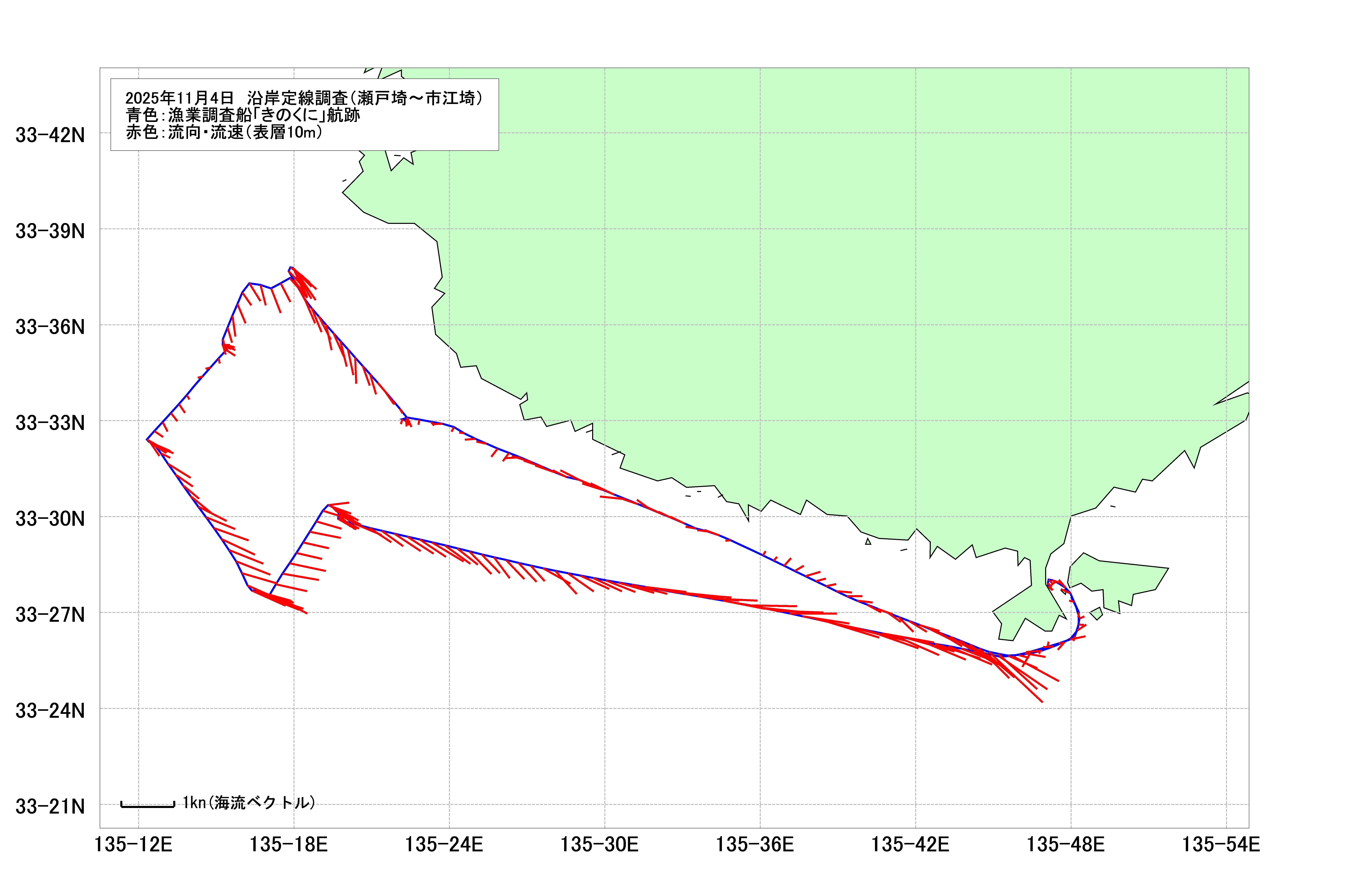 - 沿岸定線調査(瀬戸埼沖~市江埼沖)(2025年11月4日) 海洋観測速報 海表面水温等温線図 調査船航跡・潮流図
