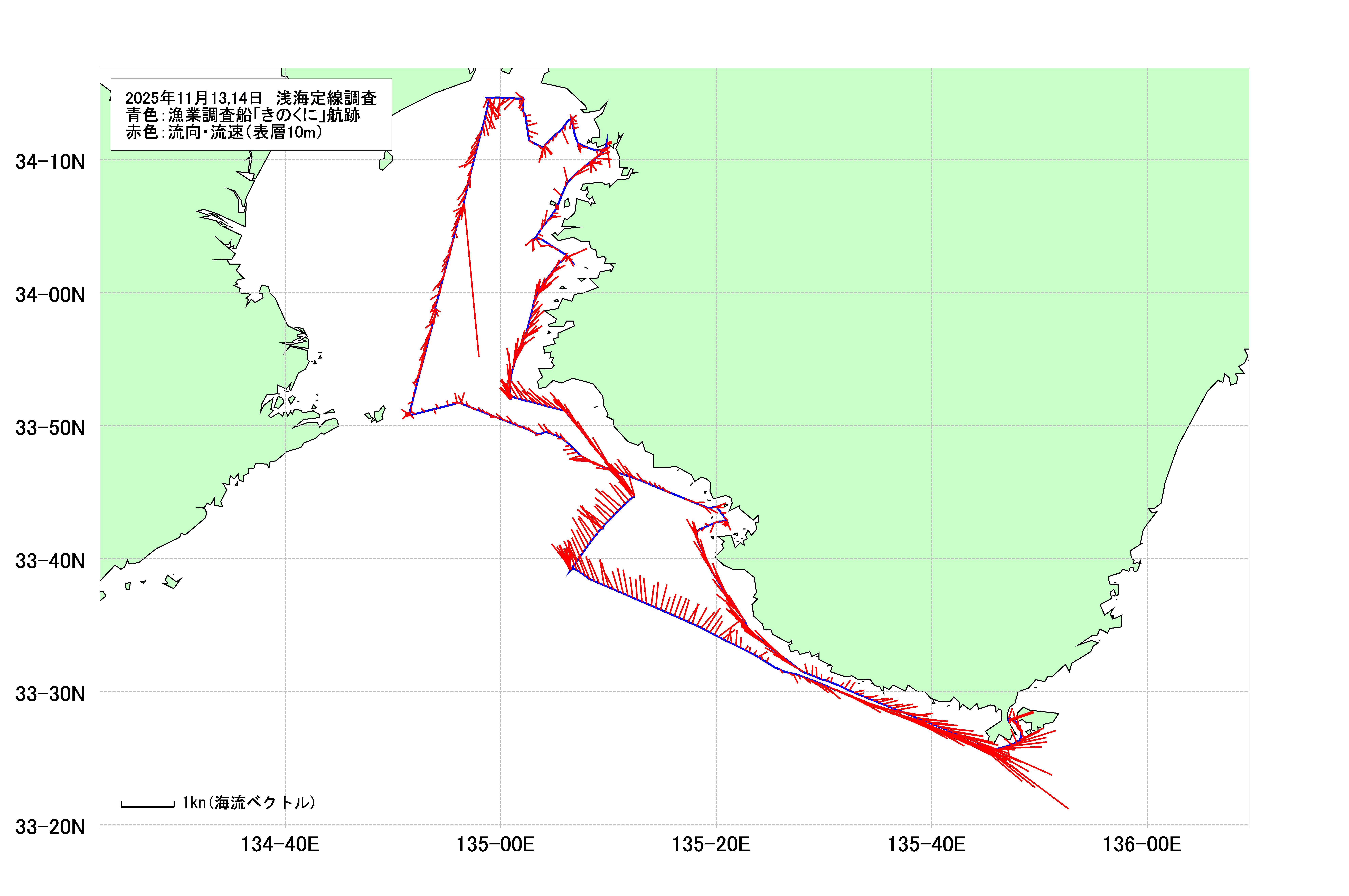 - 浅海定線調査(田倉埼沖~田辺湾)(2025年11月13日,14日) 海洋観測速報1 海洋観測速報2 海表面水温等温線図 調査船航跡・潮流図