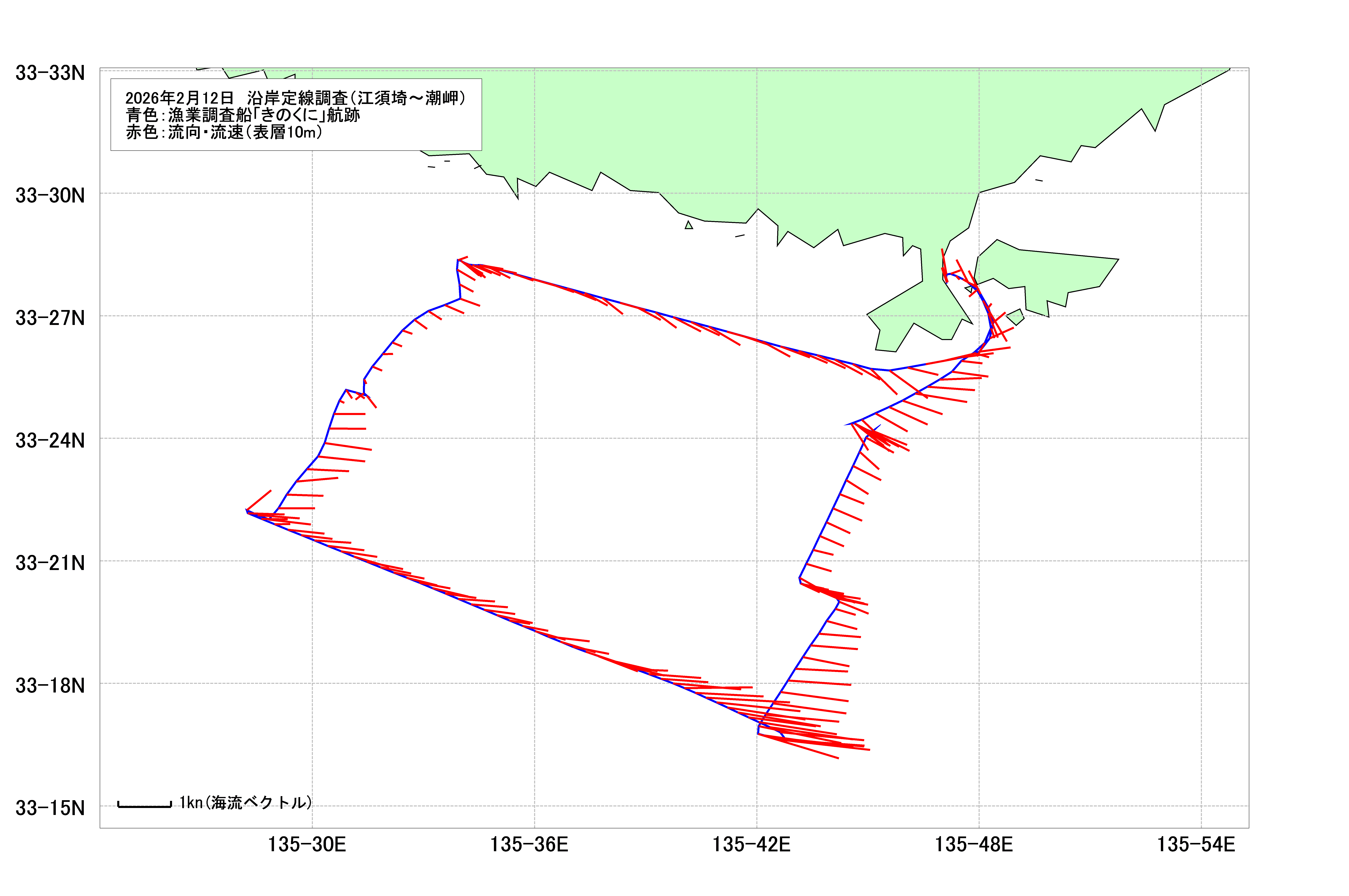- 沿岸定線調査(江須埼沖~潮岬沖)(2026年2月12日) 海洋観測速報 海表面水温等温線図 調査船航跡・潮流図