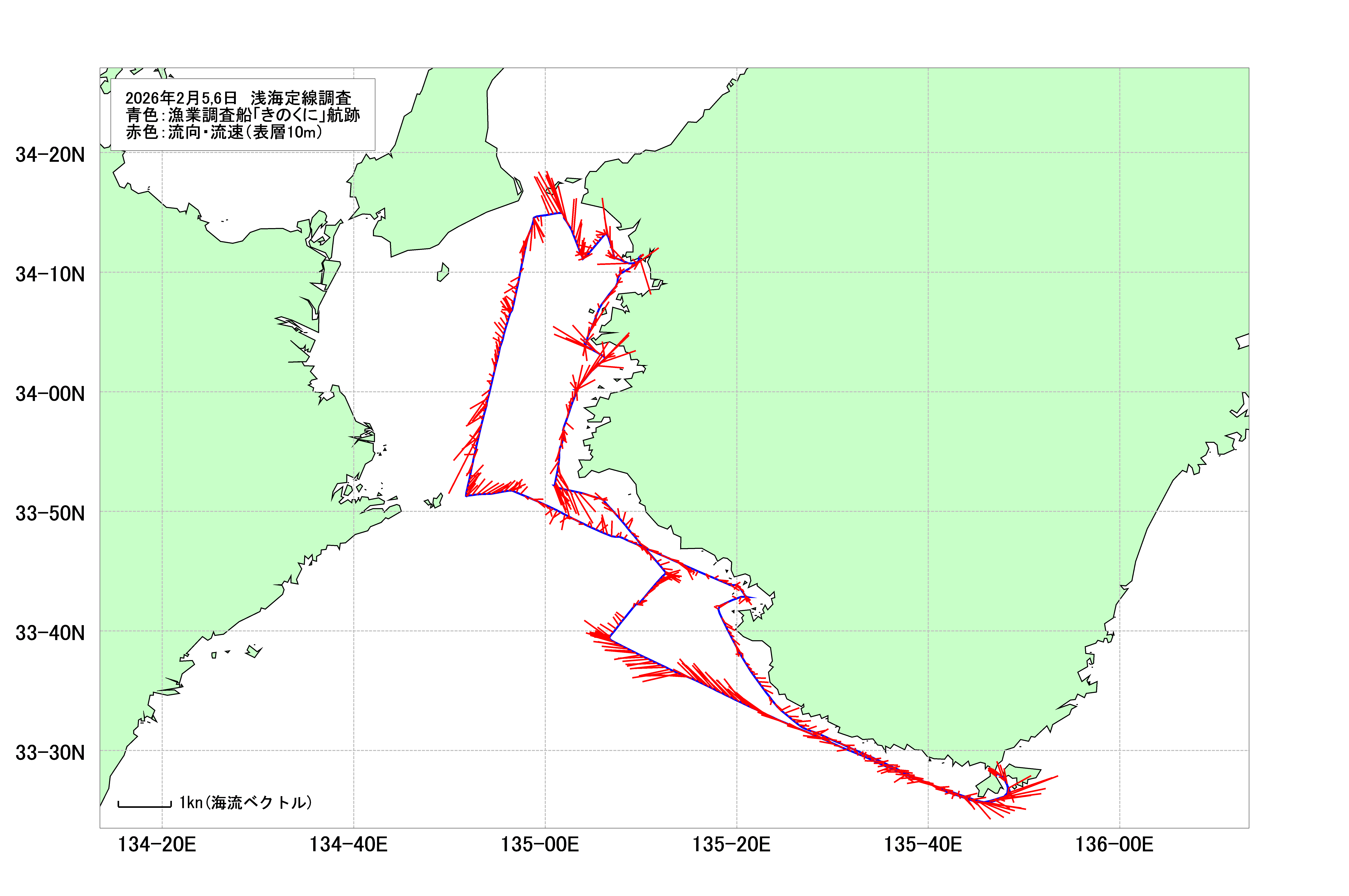 - 浅海定線調査(田倉埼沖~田辺湾)(2026年2月5日,6日) 海洋観測速報1 海洋観測速報2 海表面水温等温線図 調査船航跡・潮流図