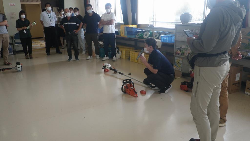 刈払機に関し燃料や刃の取り扱いについて、トラクターに関しエンジン、ブレーキなどの点検および、安全フレーム、シートベルトの装着などについて実演して頂いた。