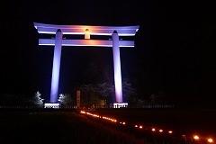 八咫(やた)の火祭りは、夕刻に開催されます。炎の御輿と時代行列が本宮大社を出発し、旧社地の大斎原(おおゆのはら)へ渡御します。地元の太鼓集団・奥熊野太鼓の勇壮な演奏などの後、炎の御輿を囲んでの熊野八咫踊り、最後に八咫花火が熊野川河原で打ち上げられます。