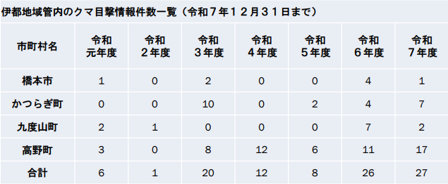 伊都地域管内のクマ目撃情報件数一覧 |