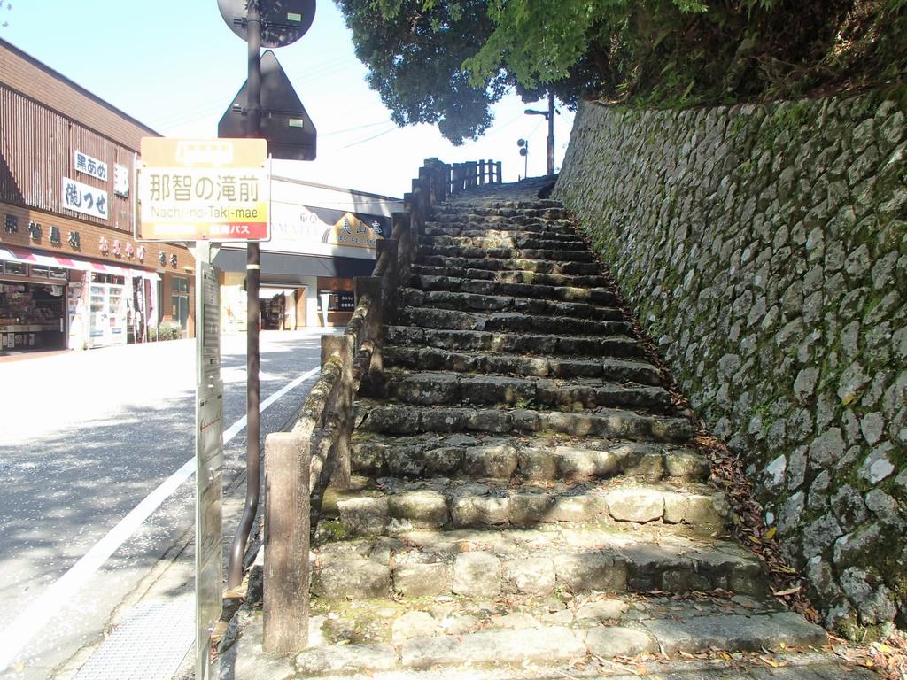 那智山は、バスで行くと、下の大門坂駐車場から、次のバス停で、途中から、終点まで行って上から降りる形で大門坂を歩けます。