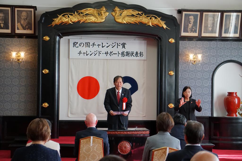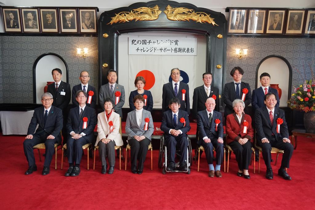 第23回紀の国チャレンジド賞及びチャレンジド・サポート感謝状授与式が和歌山県庁の正庁で開催され、県議会からは岩田弘彦議長、福祉環境委員会北山慎一委員長が来賓として出席しました。