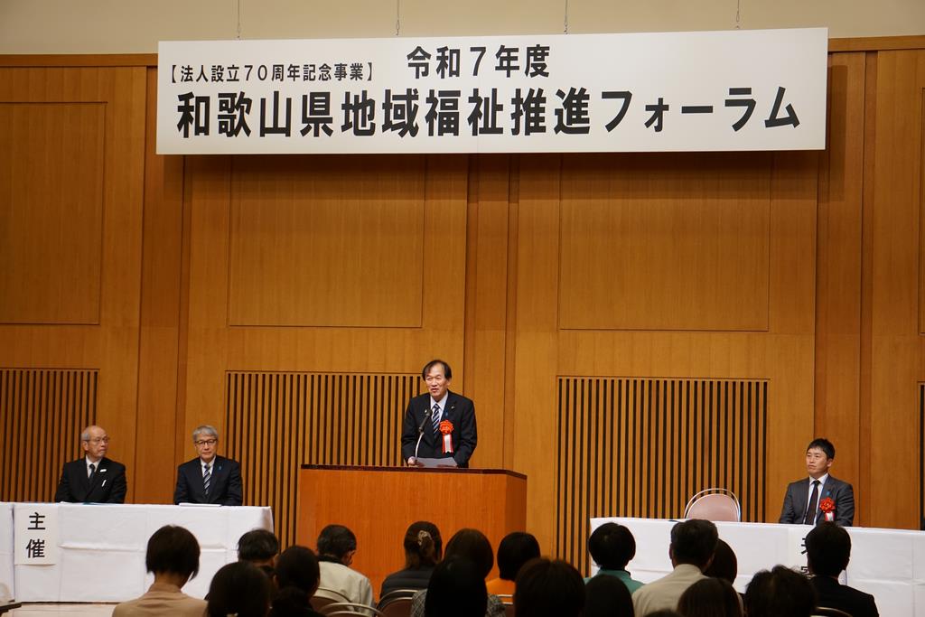 社会福祉法人 和歌山県社会福祉協議会の設立70周年記念事業として、和歌山県地域福祉推進フォーラムが和歌山市の県民交流プラザ和歌山ビッグ愛で開催され、県議会から岩田弘彦議長、福祉環境委員会北山慎一委員長が来賓として出席しました。