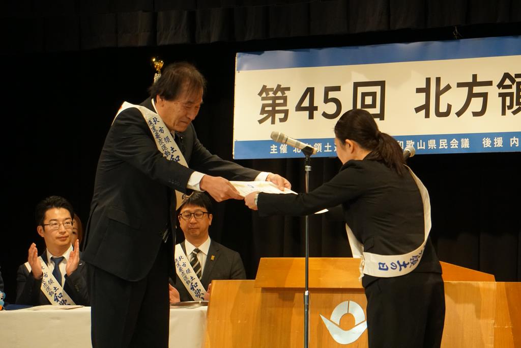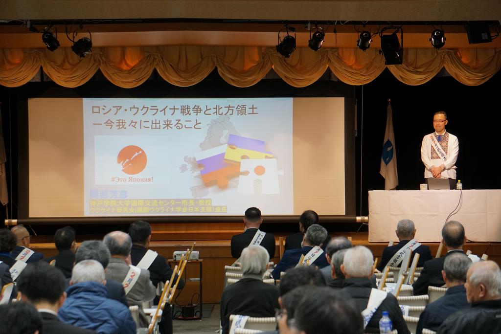 第45回北方領土返還要求和歌山県民大会が橋本市教育文化会館で開催され、北方領土返還要求運動和歌山県民会議の会長として岩田弘彦議長が挨拶を述べました。続いて、表彰状の授与、北方領土返還要求運動の原点の地である根室市での現地研修に参加した橋本市立紀見東中学校の生徒の皆さんによる学習報告などが行われたのち、神戸学院大学経済学部教授の岡部芳彦氏を講師に迎え、「ロシア・ウクライナ戦争と北方領土」と題して講演がありました。
