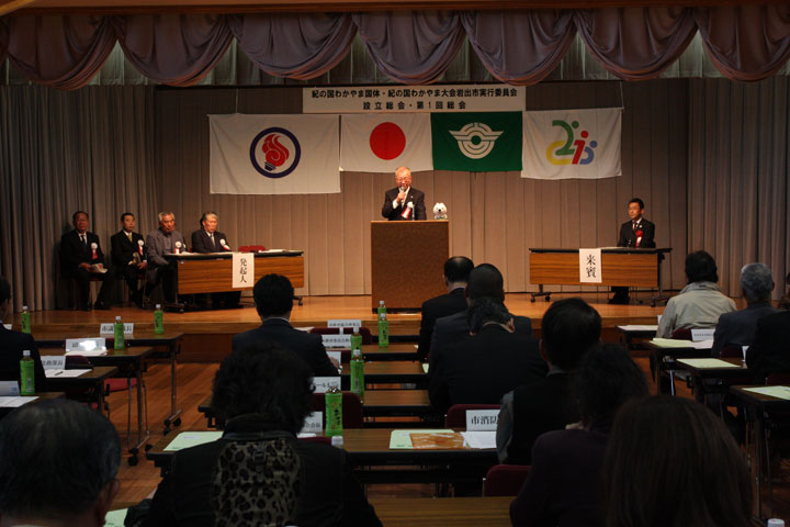 設立発起人会を代表してあいさつを行う中芝岩出市長